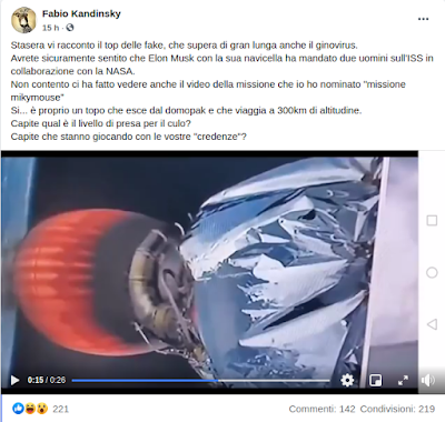 June 1, 2020 10:31Mi stanno arrivando segnalazioni secondo le quali numerosi diversamente furbi, laureatisi in propulsione aerospaziale all’Università Missilistica di YouTube, dicono di aver “scoperto” un topolino che corre lungo il motore di un razzo di SpaceX mentre si trova nel vuoto dello spazio.