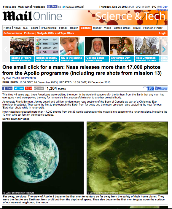 December 27, 2013 17:35 - no comments yet45 anni fa si concludeva il primo volo umano intorno alla Luna. Nei giorni scorsi mi sono divertito a fare un livetweet in tempo "reale" della missione. Se vi interessa, lo trovate raccolto qui sotto tramite Storify.