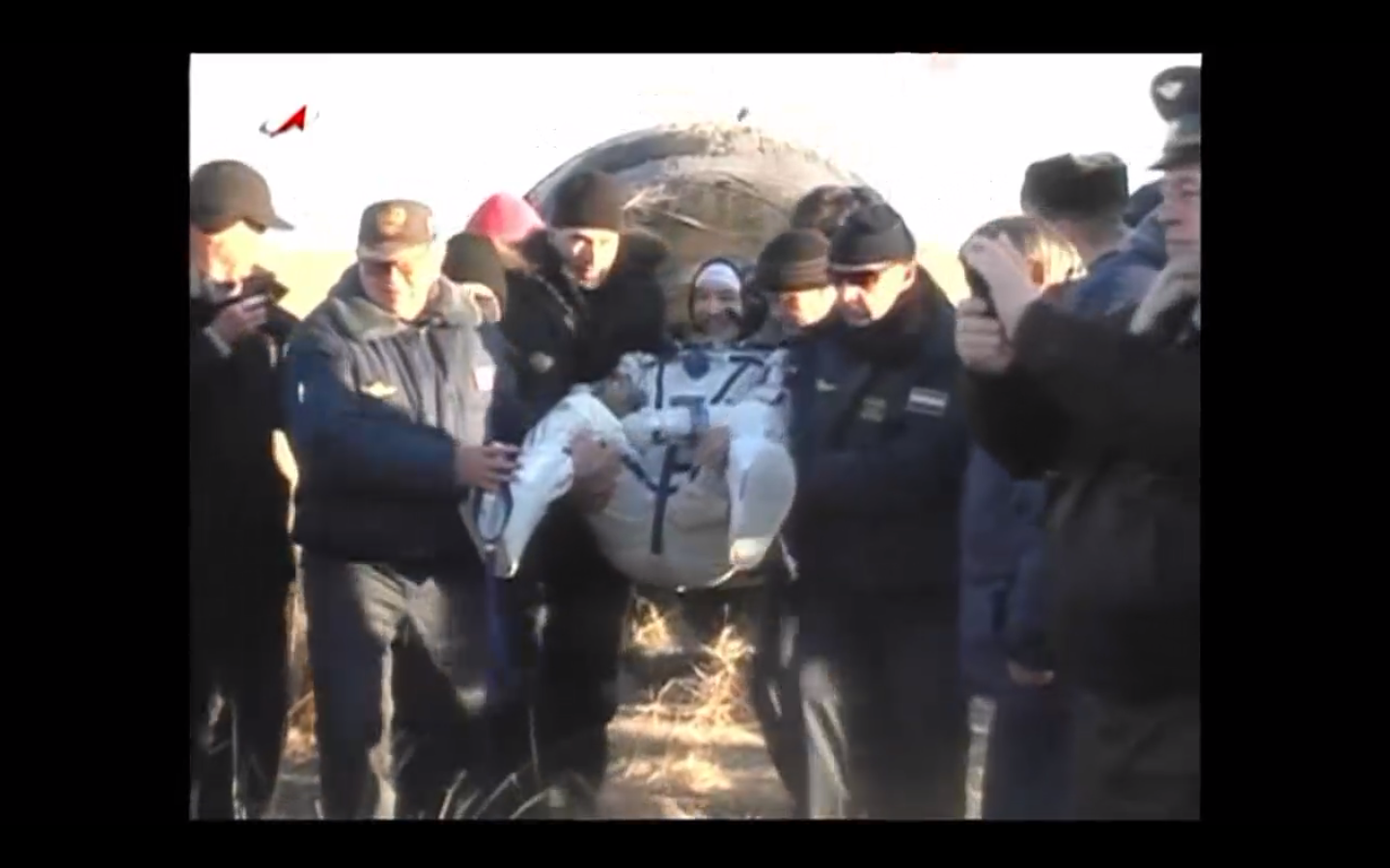 Ed eccoli, estratti dalla capsula e messi subito seduti per sopportare l'improvviso passaggio dall'assenza di peso alla gravità terrestre.