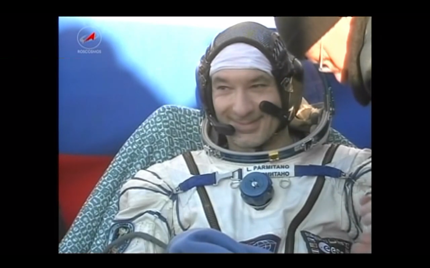 Luca fa capolino da dentro la Soyuz poco prima che si chiuda il portello.