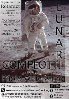 October 24, 2013 7:23 - no comments yet Questo sabato (dopodomani, 26 ottobre) alle 17 sarò alla Focacceria San Francesco di via San Paolo 15 a Milano per una conferenza dedicata specificamente al tema del complottismo lunare organizzata dal Rotaract Visconteo. Questa conferenza è distinta dall'incontro di lunedì 28 al Museoscienza insieme a Giovanni Caprara, che sarà dedicato alla riscoperta dell'avventura spaziale che ha portato un pezzo di Luna a Milano, non alle tesi di complotto.La conferenza di sabato sarà seguita da un aperitivo alle 19:30. L'ingresso include conferenza e aperitivo e costa 15 euro: il ricavato sarà devoluto al Service Keep on Smiling, che si occupa di assistere i bambini ricoverati presso la Clinica De Marchi di Milano giocando con loro e intrattenendoli attivamente e sta raccogliendo fondi, insieme ad altre associazioni, per una borsa di studio per un ricercatore biologo che operi presso la Clinica e per l'acquisto di materiale per il reparto di pediatria.