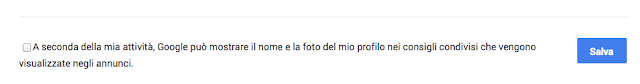 Se siete allarmati all'idea che prossimamente (dall'11 novembre) Google potrà usare il vostro nome e la vostra foto del profilo Google nelle proprie inserzioni, niente panico. Basta andare a questa sezione delle impostazioni dell'account, disattivare la casella di spunta A seconda della mia attività, Google può mostrare il nome e la foto del mio profilo nei consigli condivisi che vengono visualizzate [sic] negli annunci e poi cliccare su Salva. Così: