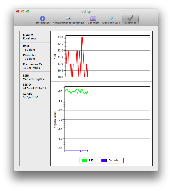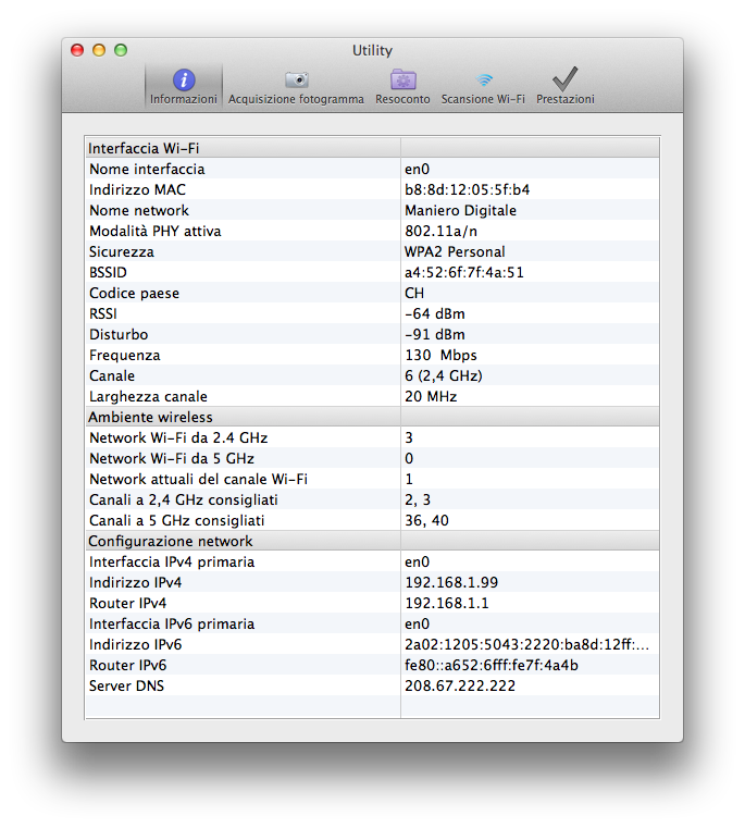 Il primo cambiamento significativo che ho notato è la scomparsa (apparente) di una utility integrata molto comoda per la gestione delle reti Wifi, ossia Wifi Diagnostics (documentata qui). Per riattivarla (oggi si chiama Wireless Diagnostics in inglese) si preme il tasto Opzione, si clicca sull'icona del WiFi e si sceglie Apri Diagnosi Wireless. Compare già qui una serie di info diagnostiche interessanti, ma andando avanti (e dando la password di amministratore) si può scegliere dal menu Finestra la voce Utility, che fornisce vari strumenti di analisi della connessione senza fili.