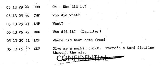 Lega Nerd ha pubblicato oggi un articolo nel quale viene citato uno spezzone decisamente insolito delle conversazioni degli astronauti John Young, Gene Cernan e Tom Stafford durante la missione Apollo 10, la prova generale dell'allunaggio, avvenuta fra il 18 e il 26 maggio 1969. Lo spezzone ha suscitato una certa ilarità mista a incredulità, perché gli astronauti stanno discutendo su chi dei tre sia l'autore di una cacca che fluttua in cabina. Ecco un brano dell'austero dibattito: