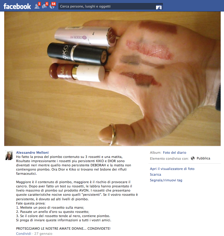 Risultato impressionante i rossetti piu persistenti KIKO e DIOR sono diventati neri mentre quello meno persistente DEBORAH e la matita non contiengono piombo. Ora Dior e Kiko si trovano nel bidone dei rifiuti farmaceutici.