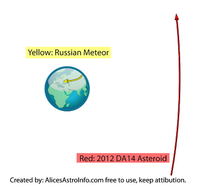 Per chi si chiede se per caso la meteora russa è correlata all'asteroide DA14, c'è questo spiegone e c'è anche questo diagramma molto chiaro che mostra la differenza radicale delle loro traiettorie, che indica che non c'è nessun legame fra i due eventi: