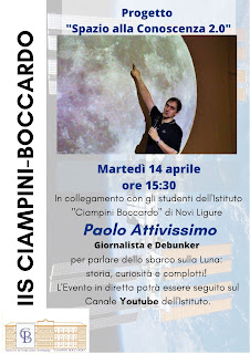 April 14, 2020 8:52Oggi alle 15:30 sarò in diretta sul canale Youtube dell’Istituto Ciampini-Boccardo di Novi Ligure per parlare della storia dello sbarco sulla Luna, con chicche, curiosità e (inevitabilmente) complotti reali e immaginati.È uno degli appuntamenti del progetto didattico “Spazio alla Conoscenza 2.0”, approvato e seguito dal MIUR.