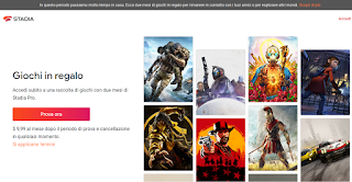 April 10, 2020 6:13Google Stadia, la piattaforma di videogioco di Google che non richiede una console ma solo un abbonamento e una connessione a Internet, sarà gratis per due mesi in versione Pro.L’idea di Google è tecnicamente ambiziosa ed economicamente allettante: i giochi vengono eseguiti sui computer di Google e le immagini risultanti vengono trasmesse in streaming ai dispositivi del giocatore (TV con Chromecast Ultra, smartphone compatibile o computer con browser Google Chrome) con una latenza minima e in alta definizione (fino a 4K nella versione Pro), e così il giocatore non ha più bisogno di sborsare per l’acquisto di una console o di un computer per videogiochi e per i suoi aggiornamenti, ma si limita ad acquistare il solo controller Stadia (o usare il mouse) e a pagare l’abbonamento mensile a Google se vuole la versione Pro.