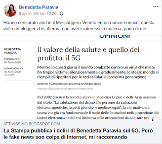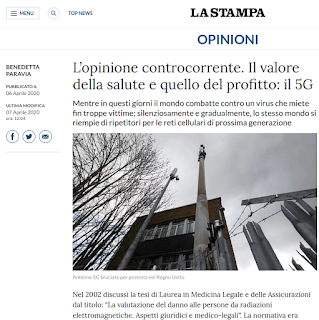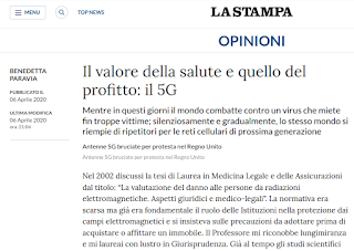 Mi limito a notare che La Stampa adesso spaccia l’articolo della Paravia per una “opinione controcorrente”, con tanto di titolo modificato, ma in realtà lo aveva pubblicato inizialmente nella sezione Cronaca, come evidenzia l’URL originale (www.lastampa.it/cronaca/2020/04/06/news/il-valore-della-salute-e-quello-del-profitto-il-5g-1.38686965), diverso da quello successivo (www.lastampa.it/opinioni/2020/04/06/news/il-valore-della-salute-e-quello-del-profitto-il-5g-1.38686965).