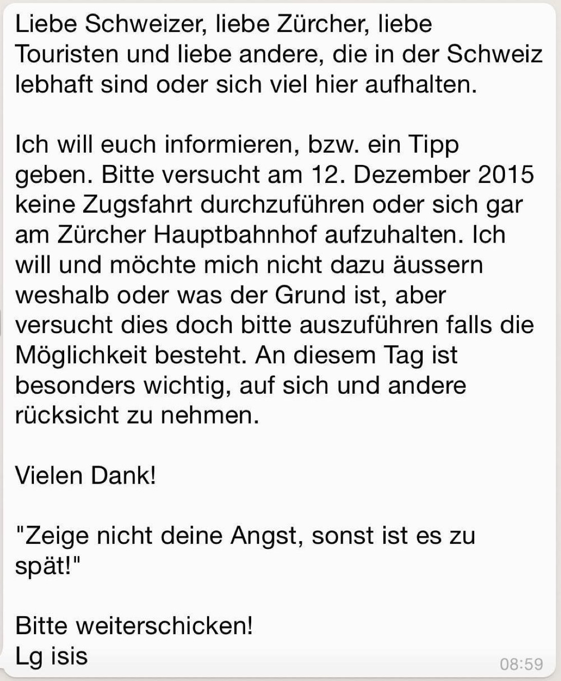 20 de Novembro de 2015, 3:34A quanto pare non a tutti è ben chiaro che quello che si scrive in un social network non è privato e non è anonimo e che anche nel mondo virtuale le parole hanno un peso. Non è chiaro, in particolare, alla persona che ha pubblicato alcuni giorni fa su WhatsApp un avviso di non prendere il treno e non recarsi alla stazione di Zurigo il prossimo 12 dicembre, seguito dall’invito a inoltrare a tutti l’avvertimento.Il messaggio ha puntualmente preso a circolare all’impazzata, causando ovviamente apprensione a molti dopo gli attentati di Parigi, ma la Polizia della città di Zurigo ci ha messo poco a rintracciare l’origine del falso allarme e scoprire che si tratta di un diciannovenne svizzero, domiciliato nel canton Zurigo, che è stato fermato e interrogato dalle autorità.