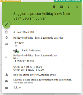 octubre 3, 2018 5:26Qualche giorno fa ho trovato nel mio Google Calendar un appuntamento falso: un soggiorno a un Holiday Inn vicino a Nizza per domani e dopodomani, che non ho prenotato e che non ho in programma.Calendar mi dice che “l’evento è stato creato automaticamente da un’email”, ma se clicco su quest’informazione non vengo portato alla mail creatrice. Non è un grande aiuto.