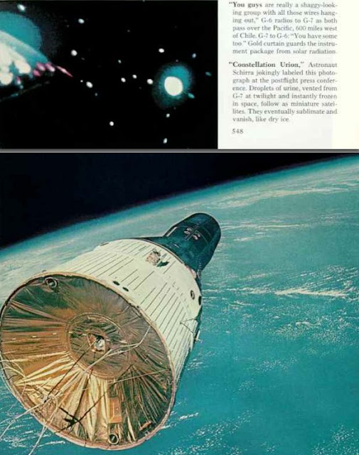 | L’urina scaricata nello spazio crea la “costellazione di Orinone” (da National Geographic, aprile 1966). Credit: NASA/National Geographic. |