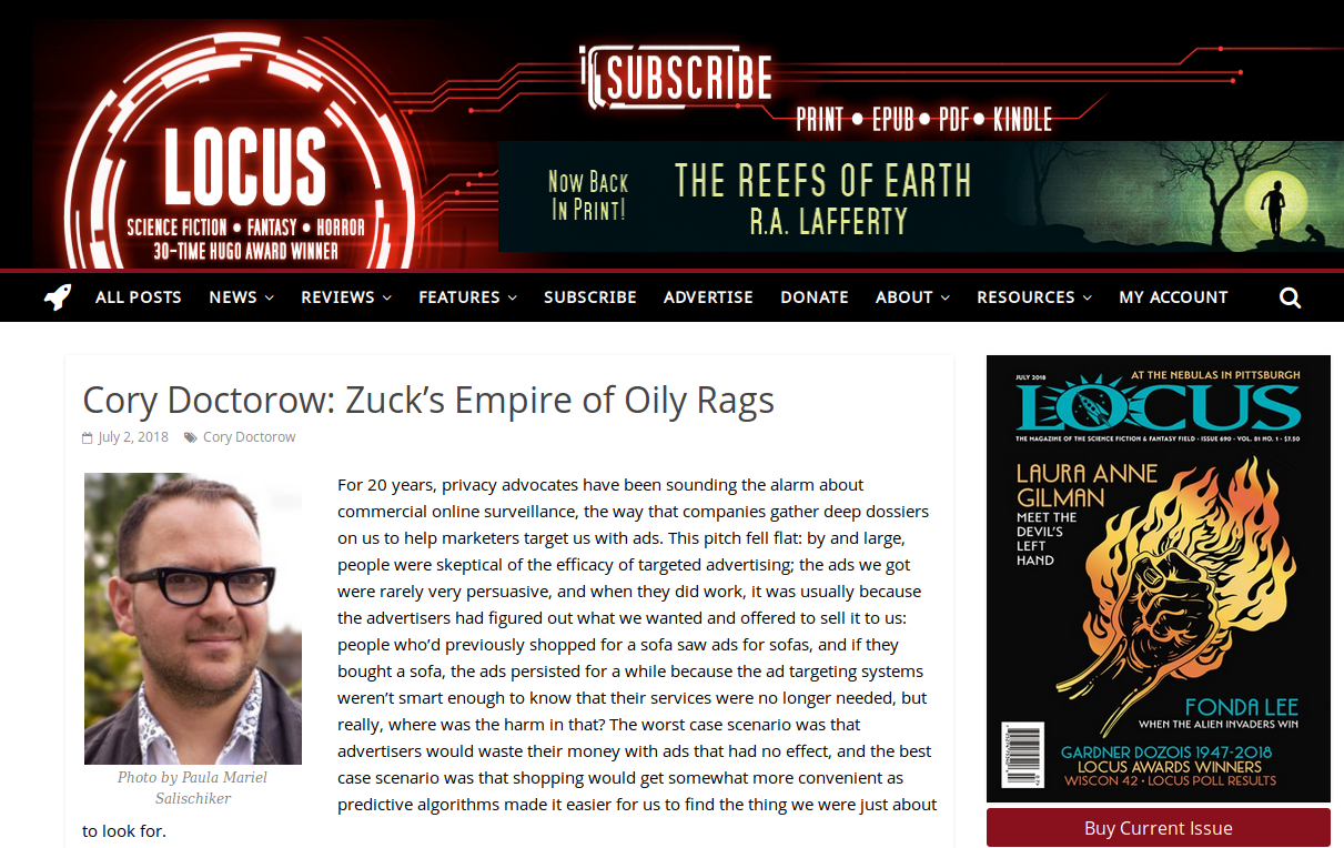 julio 4, 2018 16:57Cory Doctorow è consulente speciale della Electronic Frontier Foundation, visiting professor di informatica alla Open University e un Research Affiliate dell’MIT Media Lab; ha scritto vari libri, fra cui Walkaway, Little Brothere e Information Doesn’t Want to Be Free.Ho già tradotto tempo fa un suo saggio sulla guerra in atto contro il computer generico, che a distanza di quattro anni si sta avverando in modo preoccupante. Pochi giorni fa Doctorow ha pubblicato sulla rivista Locus l’articolo Zuck’s Empire of Oily Rags (“Zuckerberg e il suo impero di stracci imbevuti di petrolio”), che traduco qui sotto perché credo che sia altrettanto importante, illuminante e lungimirante.