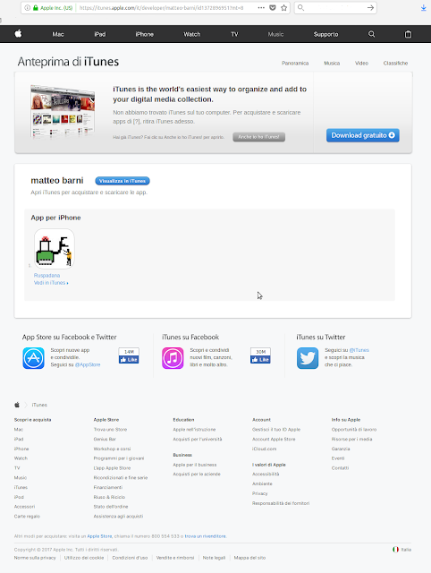 Poche ore dopo, l’app è stata rimossa dall’App Store ed è scomparso da lì anche il profilo dello sviluppatore Matteo Barni. Questo è uno screenshot del profilo, dal quale risulta che l’unica app a lui intestata è Ruspadana: