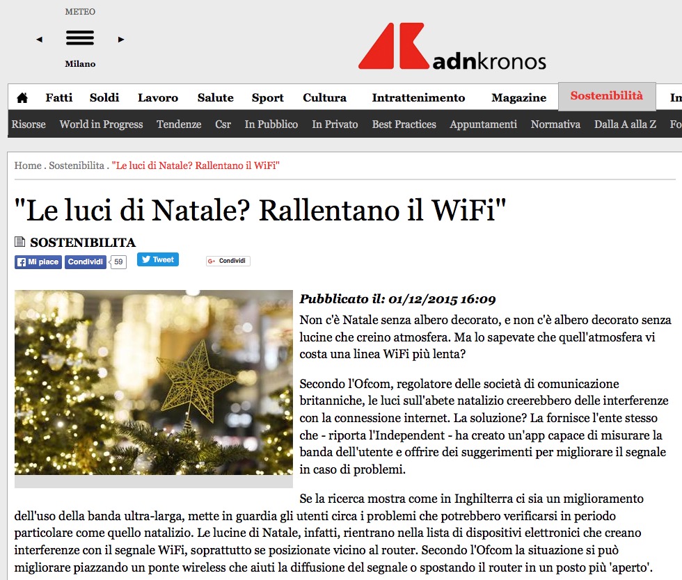 In altre parole, le luci di Natale sono soltanto uno dei tanti possibili elementi di disturbo radio e vengono anzi citati come caso improbabile ed estremo. Ma l’idea delle lucine che bloccano Wi-Fi è giornalisticamente irresistibile e quindi il comunicato stampa è stato completamente travisato, scartando tutte le altre fonti di possibile interferenza.