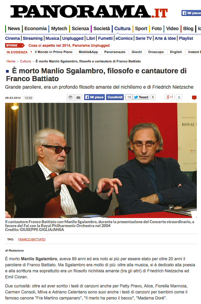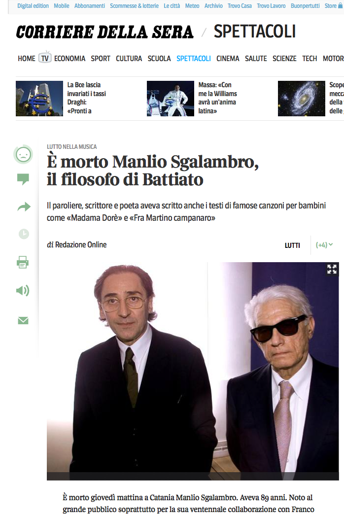 Sì, avete letto bene: “È morto Manlio Sgalambro, il filosofo di Battiato - Il paroliere, scrittore e poeta aveva scritto anche i testi di famose canzoni per bambini come «Madama Dorè» e «Fra Martino campanaro»”.