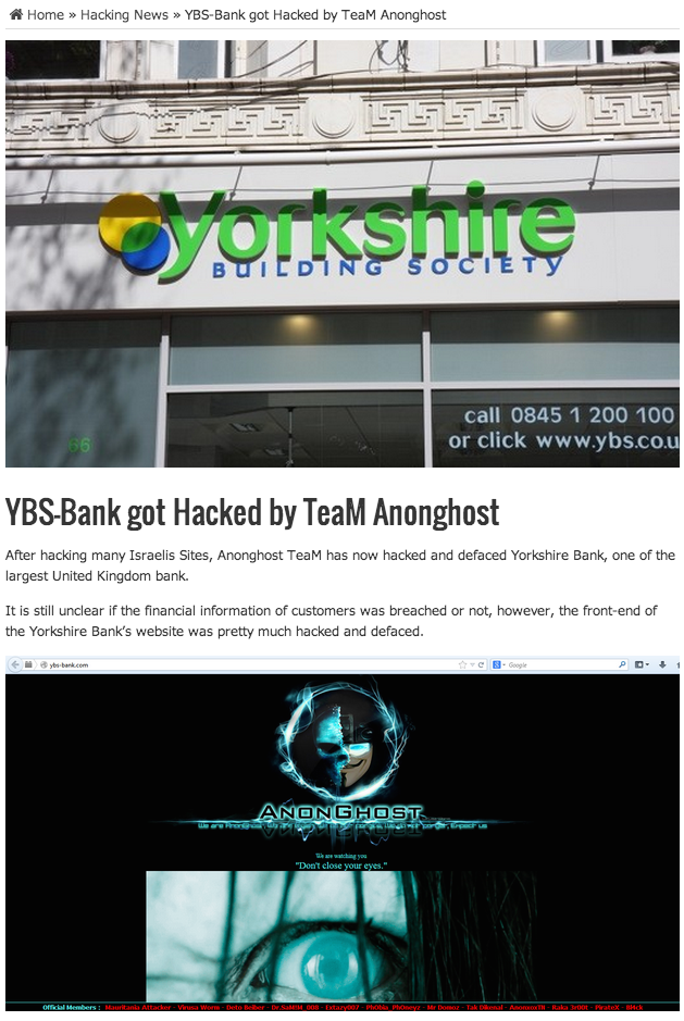marzo 7, 2014 7:31 - no comments yetFigura barbina per Team Anonghost, un gruppo di vandali informatici che si è vantato di aver penetrato le difese digitali di un'importante banca britannica e di averne deturpato il sito.Annunciando la trionfale scorribanda su p0ison e su Zone-h, gli Anonghost hanno dichiarato di aver colpito “la Yorkshire Bank, una delle più grandi banche del Regno Unito”. Solo che il bersaglio preso di mira non è affatto una banca: è il sito-trappola gestito da una banda di criminali, che simula la Yorkshire Bank per rubare password e soldi ai correntisti con la classica tecnica del phishing.