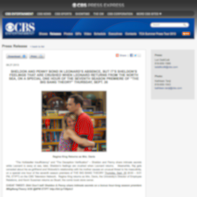 Seguo Big Bang Theory. Ieri sera Kaley Cuoco, su Twitter, ha segnalato il comunicato stampa della CBS che annuncia la data e i dettagli della prossima puntata e ha postato questo link: bit.ly/15uUJ73. Che dovrebbe portare al comunicato, ma non è accessibile perché sottoposto a restrizioni geografiche: "Sorry. This site is not available from your location."