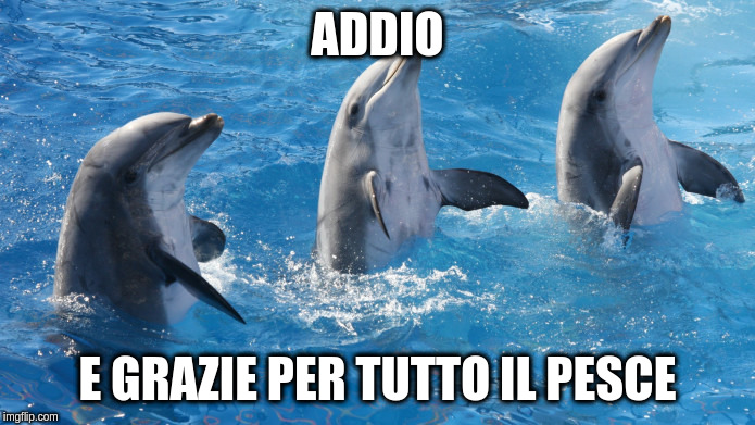 Se non fosse sufficientemente chiaro, quindi, so benissimo che il delfino non è un pesce: il pesce citato nel meme è quello che i delfini hanno mangiato ricevendolo dagli umani. E dire a qualcuno “Addio, e grazie per tutto il pesce” significa “Nonostante miei ripetuti tentativi di comunicare e spiegarti le cose, la tua boria e la tua stupidità ti impediscono di capire che cosa ti sto dicendo e quindi è inutile che io ti dedichi tempo. Anche se ti sembra impossibile, vivo benissimo e me la spasso anche senza di te e non sento il bisogno insopprimibile di dialogare con te. La conversazione è finita.”