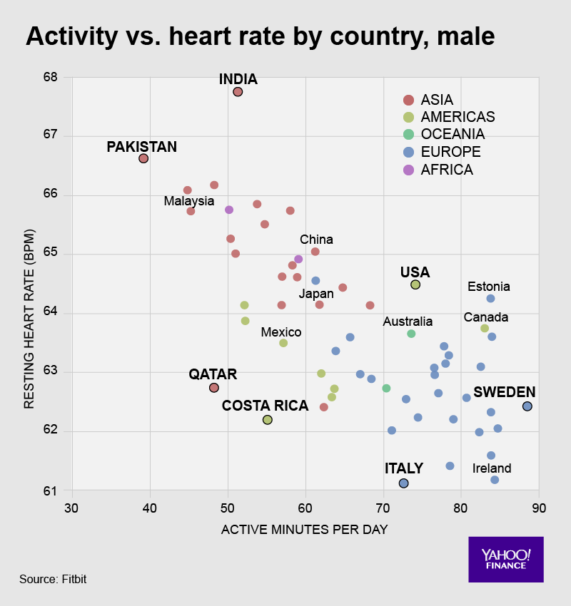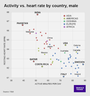 Ci sono molti altri indicatori interessanti nell’articolo di Yahoo: ne segnalo ancora uno che farà piacere agli italofoni. Come mostrato nella figura qui sopra, gli italiani (perlomeno quelli che usano i Fitbit) sono in ottima forma, con una media di 84 minuti giornalieri di attività e una frequenza cardiaca a riposo molto bassa (61 pulsazioni al minuto).