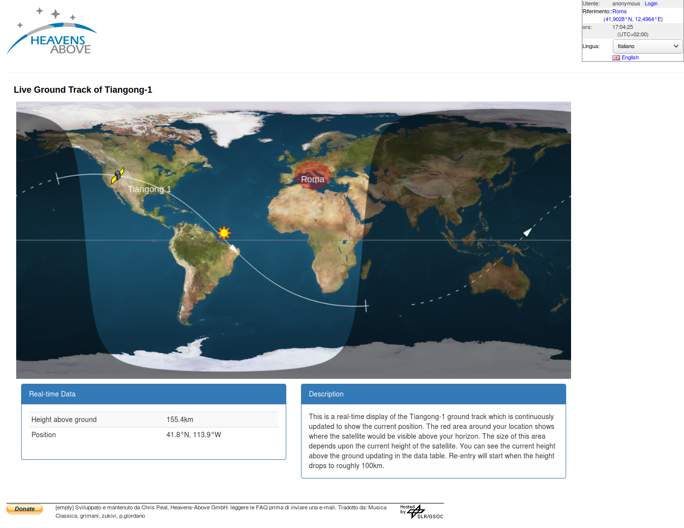 Se volete vedere la traiettoria della stazione spaziale cinese Tiangong-1, la cui caduta è ormai questione di ore (con probabilità microscopiche di frammenti che sopravvivono al rientro), seguite queste istruzioni.