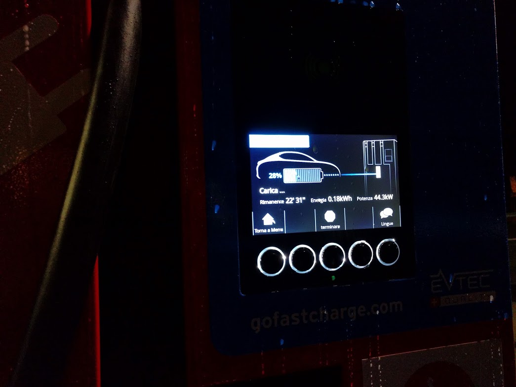 Ho messo l’auto sotto carica lenta alla colonnina Emoti di Biasca, che ho pagato con l’apposita app, e sono andato a cena con la Dama del Maniero. Un’oretta di carica (2,9 kWh, 1,66 CHF) mi ha riportato a 9 kWh, ossia 47 km di autonomia, sufficienti per raggiungere, dopo la lezione, la colonnina veloce GOFAST di Cadenazzo (31 km) lungo la strada del ritorno al Maniero.