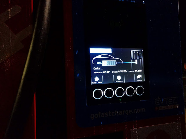 Fatto questo, siamo tornati al Maniero, dove ho messo l’auto di nuovo sotto carica per l’indomani. Percorrenza totale: 117 km. Tempo extra: 23 minuti, trascorsi lavorando e chiacchierando.