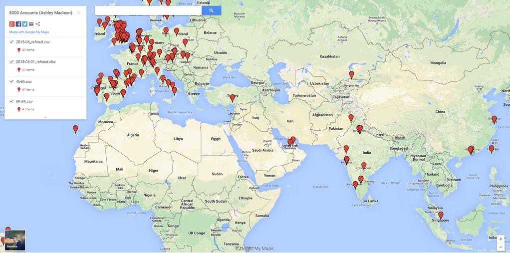 Sono già disponibili vari siti Web, come Ashleymadisonleaked.com, Trustify.info, Ashley.cynic.al, che permettono di fare ricerche all'interno dei dati trafugati. Ce n'è persino uno che localizza i vari account su una mappa di Google come quella mostrata qui accanto.