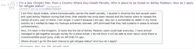 C'è poco da scherzare, come indica un appello (ovviamente non verificabile) pubblicato in Rete da un omosessuale saudita che ha usato Ashley Madison per cercare partner durante gli anni trascorsi negli Stati Uniti e che ora risiede in Arabia Saudita e teme per la propria vita: