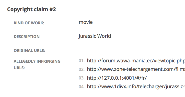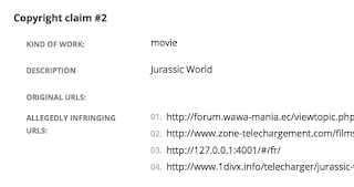 Figuraccia per la filiale francese della Universal Pictures: nell'ambito della propria lotta alla pirateria audiovisiva ha dato incarico a una società, la Trident Media Guard, di pattugliare Internet alla ricerca di violazioni del diritto d'autore e di denunciare gli indirizzi IP dei pirati per farli oscurare. Solo che fra gli indirizzi IP denunciati a Google, specificamente per aver piratato il film Jurassic World, c'è anche il 127.0.0.1.