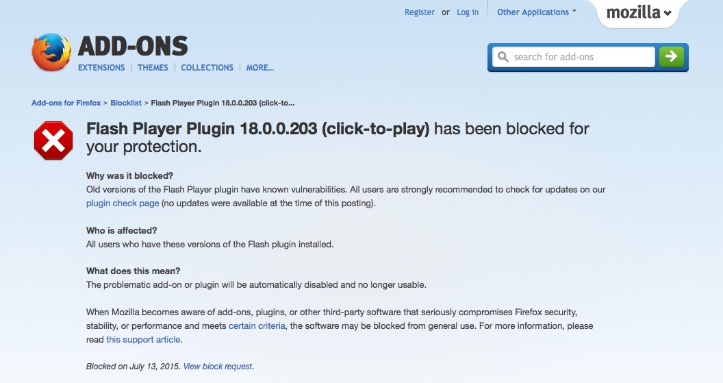 July 14, 2015 6:09Tutte le versioni di Flash, compresa la più recente, sono ora bloccate automaticamente in Firefox e, stando alle segnalazioni di molti utenti, anche in Google Chrome.Il blocco è dovuto alle vulnerabilità rivelate dalla fuga di dati da HackingTeam ed è una mazzata per gli inserzionisti pubblicitari che insistono a usare Flash per inserire le pubblicità nei siti e per tutti quelli che hanno costruito siti-vetrina in Flash.