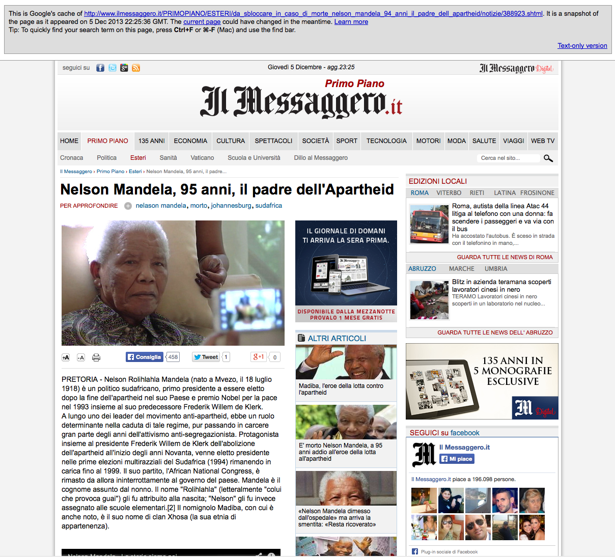 Grazie ad @Altair_Ita per lo screenshot e a @F1r3st0rm1979 per la segnalazione. La perla epica è stata corretta nel testo, ma persiste nell'URL: http://www.ilgiornale.it/news/esteri/sudafrica-padre-dellapartheid-nelson-mandela-muore-94-anni-930918.html,