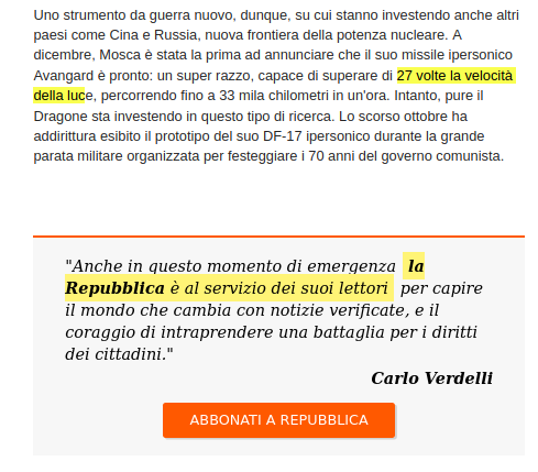 March 20, 2020 14:23Anna Lombardi, su Repubblica, scrive che la Russia ha pronto “un super razzo, capace di superare di 27 volte la velocità della luce, percorrendo fino a 33 mila chilometri in un'ora” (copia permanente su Archive.org).Per l’ennesima volta, Repubblica decide di far scrivere sulle proprie pagine gente che non sa nemmeno la differenza fra velocità della luce e velocità del suono. E Repubblica ha anche il coraggio di parlare di “notizie verificate” nel suo testo promozionale, proprio sotto un articolo che dice che 33.000 chilometri l’ora equivale a 27 volte la velocità della luce.