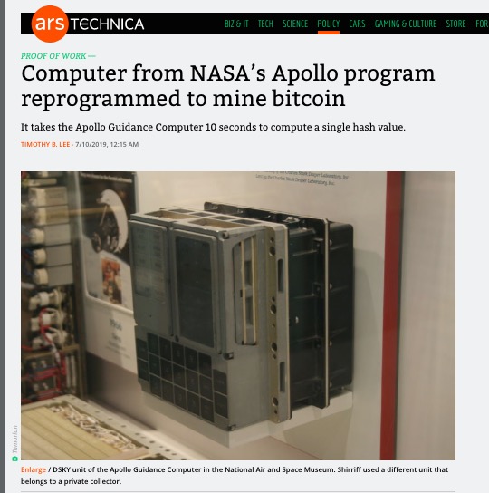July 12, 2019 3:43Ars Technica segnala che un esemplare di AGC, il computer che portò gli astronauti delle missioni Apollo sulla Luna, è stato modificato per generare bitcoin.Gli AGC erano il top della tecnologia informatica dell’epoca. Negli anni Sessanta, infatti, i computer erano grandi come frigoriferi o intere stanze, ma l’AGC pesava soltanto una trentina di chili. Fu anche uno dei primi ad adottare i circuiti integrati, che per queli anni erano una novità sperimentale.