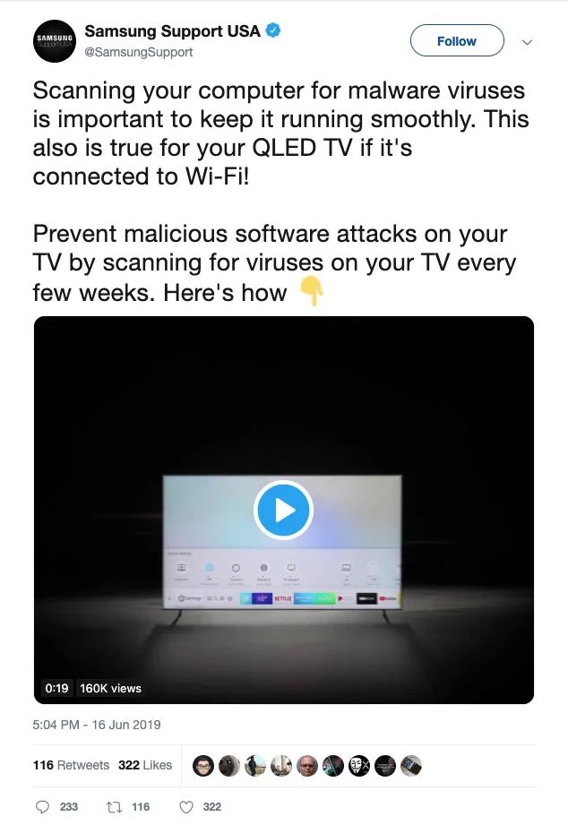 June 21, 2019 3:02Il 16 giugno scorso Samsung ha pubblicato questo tweet, salvato su Archive.org, nel quale mostrava come lanciare l’antivirus incorporato nei suoi televisori smart.
