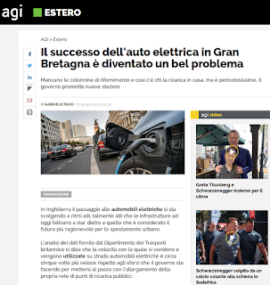 AGI ha pubblicato un articolo, Il successo dell'auto elettrica in Gran Bretagna è diventato un bel problema (copia su Archive.org), a firma di Gabriele Fazio. L’articolo dice che la creazione di punti di ricarica pubblici non riesce a stare al passo con le vendite di auto elettriche e ibride e quindi tanti utenti di questi veicoli usano metodi insicuri per caricare le proprie auto.