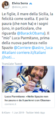 L’ultimo caso di questo virgolettato inventato ha colpito l’astronauta Luca Parmitano. Elvira Serra twitta: “Le figlie, il mare della Sicilia, la felicità come scelta. E poi la paura (che non ha) e i sogni (uno, in particolare, che riguarda @BarackObama). Il "mio" Luca Parmitano, prima della nuova partenza nello Spazio @Corriere @astro_luca #italiani”, linkando la propria intervista a Parmitano. E il titolista ribadisce: “Luca Parmitano: «Nello Spazio non ho paura e da lì parlerei con Obama»“. Una frase che Parmitano non ha mai pronunciato. Screenshot: