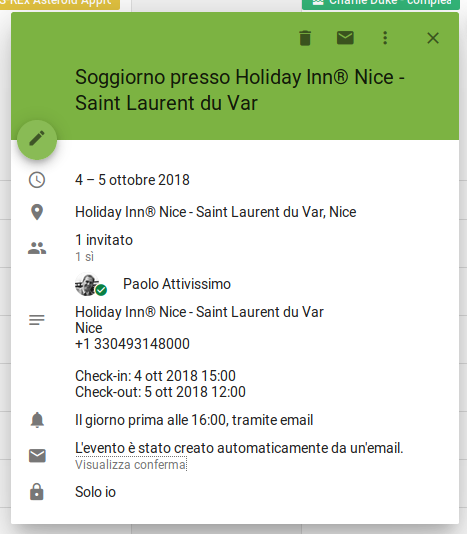 Qualche giorno fa ho trovato nel mio Google Calendar un appuntamento falso: un soggiorno a un Holiday Inn vicino a Nizza per domani e dopodomani, che non ho prenotato e che non ho in programma.