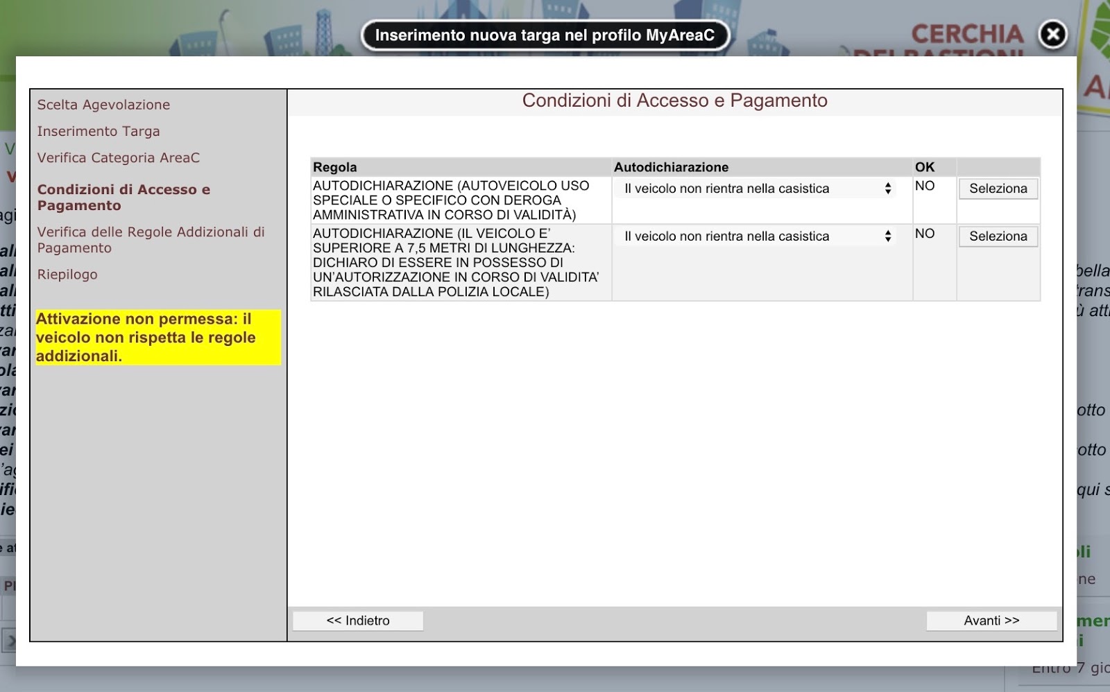 Non sto usando un’auto per un uso speciale e l’auto decisamente non è lunga più di 7,5 metri, per cui scelgo NO per entrambe le opzioni e clicco su Avanti. Mi aspetto di poter pagare, ma invece no: il mio veicolo “non rispetta le regole addizionali”. Quali siano queste regole, non si sa. Ma il sistema ha deciso che non posso pagare neanche volendo.