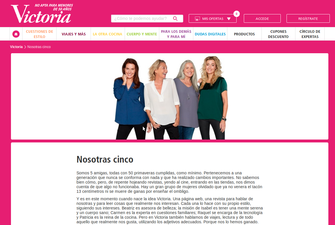 I siti Victoria50.it, .es e .fr sono di proprietà della Procter & Gamble, concetto ribadito anche qui, e contengono soltanto pubblicità di prodotti di quest’azienda. Si tratta dunque di siti pubblicitari travestiti da siti d’informazione. E che informazione: notate, per esempio, che le presunte autrici dei contenuti si presentano come “Noi cinque” anche se la foto mostra solo quattro persone (anche nella versione spagnola), ma soprattutto che le stesse donne si chiamano Maria, Laura, Lisa, Anna e Carla nella versione italiana, però sono Beatriz, Isabel, Carmen, Raquel e Patricia in quella spagnola e sono Anne, Béatrice, Catherine, Nathalie e Patricia in quella francese. Fake news industriale, insomma.