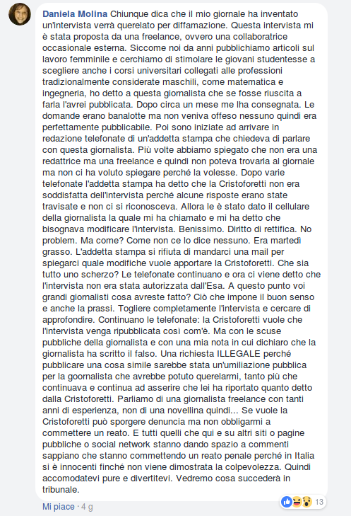 Pubblicare interviste inventate, attribuendo agli intervistati scempiaggini che non hanno mai detto, è un malcostume diffuso che affossa la già traballante credibilità del giornalismo. In un momento in cui si parla tanto di fake news, la scelta di Laura Placenti di falsificare un’intervista è una vergogna per la categoria: è un tradimento del patto sociale con i lettori. E la scelta della sua direttrice di minacciare querela a chi osa dire che il re è nudo e di accusare un’astronauta in questo modo è un atto di arroganza anche peggiore.
