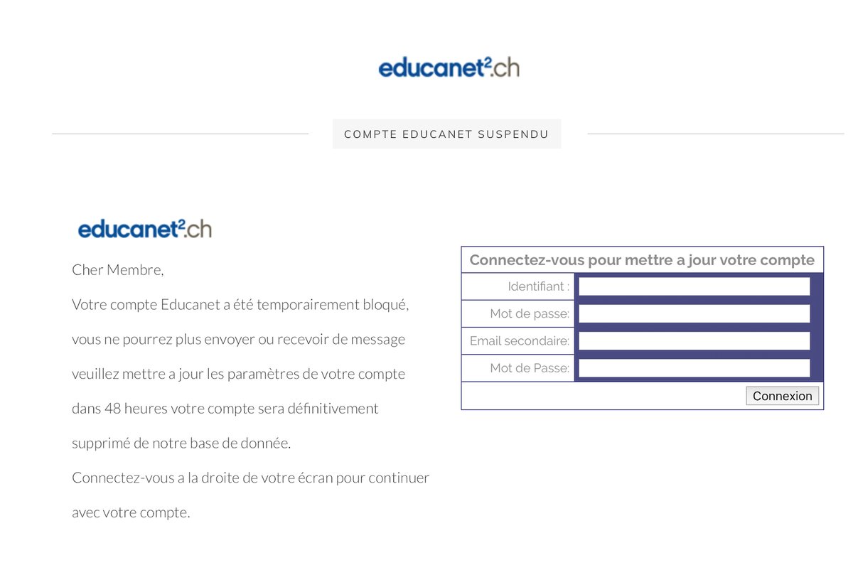 Prendete per esempio un docente: a cosa mai potrebbe servire rubargli le password di gestione del suo account scolastico? A qualcosa sicuramente serve, visto che un lettore, Decio, mi segnala questo tentativo di phishing ai danni degli utenti di educanet², che si descrive come “la piattaforma principale per l'insegnamento e l'apprendimento online in Svizzera”, creata nel 2001 su mandato della Confederazione e dei cantoni. “Oggi più del 90% delle scuole svizzere attive su di una piattaforma online lavorano con educanet²”, dice il sito.