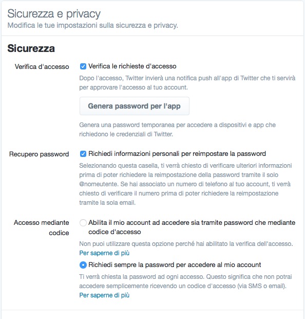 Su Twitter la verifica in due passaggi si attiva andando a https://twitter.com/settings/security e attivando la voce Verifica d’accesso. Già che ci siete, attivate anche le opzioni Richiedi informazioni personali per reimpostare la password e Richiedi sempre la password per accedere al mio account.