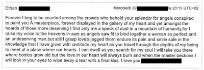 Man mano il rapporto via Facebook passa dalla semplice conversazione alla fiducia e all’amore. I messaggi di Ethan e Angelica sono centinaia, assidui e intensamente romantici, anche se la grammatica e la poetica non sono sublimi.