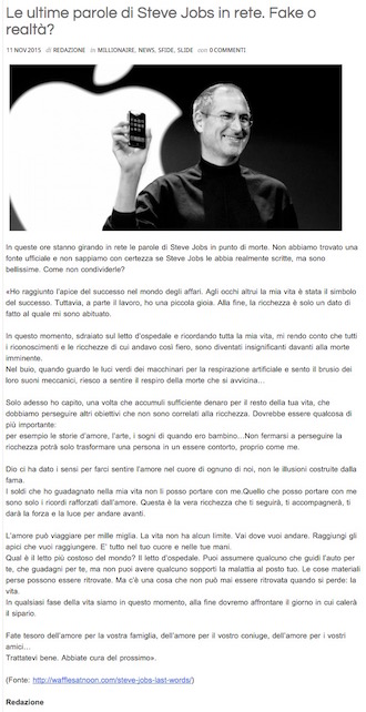 Stanno circolando in Rete delle parole che vengono attribuite a Steve Jobs e sarebbero state pronunciate da lui in punto di morte. Ne parla per esempio Millionaire.it. Lo fa un po’ pigramente, perché cita la fonte della notizia senza accorgersi che quella fonte smentisce la notizia.