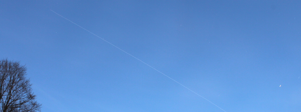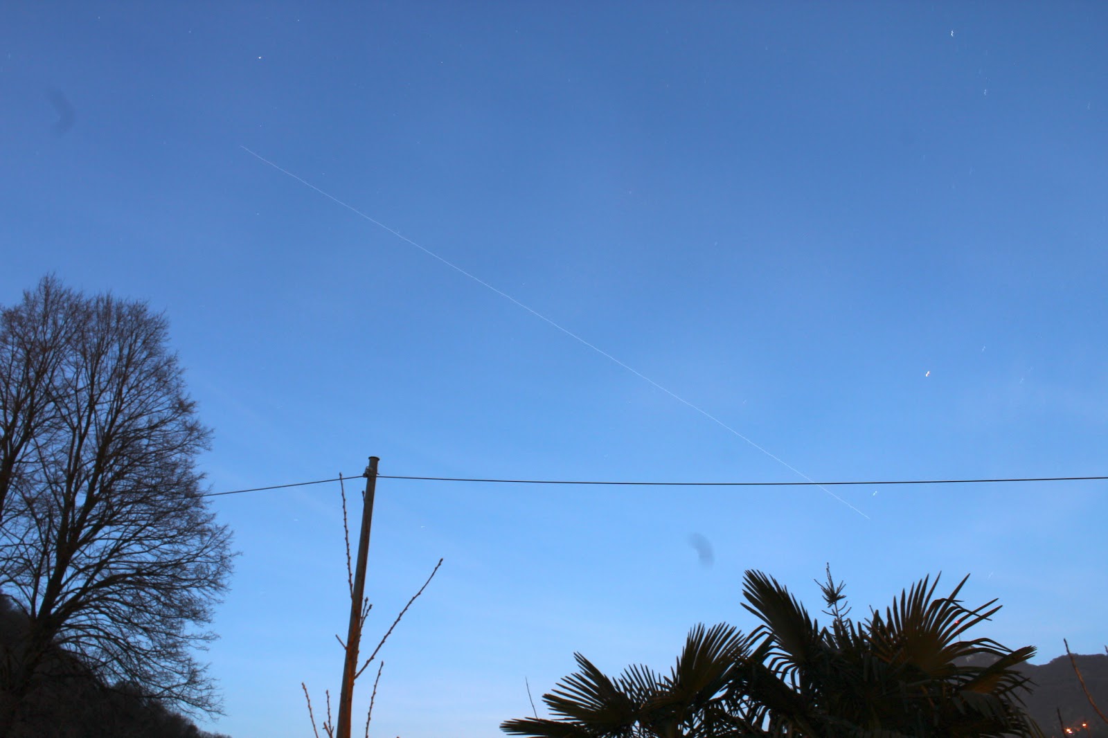 Lezioni imparate: per un passaggio relativamente fioco quando il cielo non è del tutto buio conviene rinunciare a fotografare l'intera scia, altrimenti il cielo si rischiara troppo, e f/11 ISO 100 è un'impostazione un po' troppo chiusa.