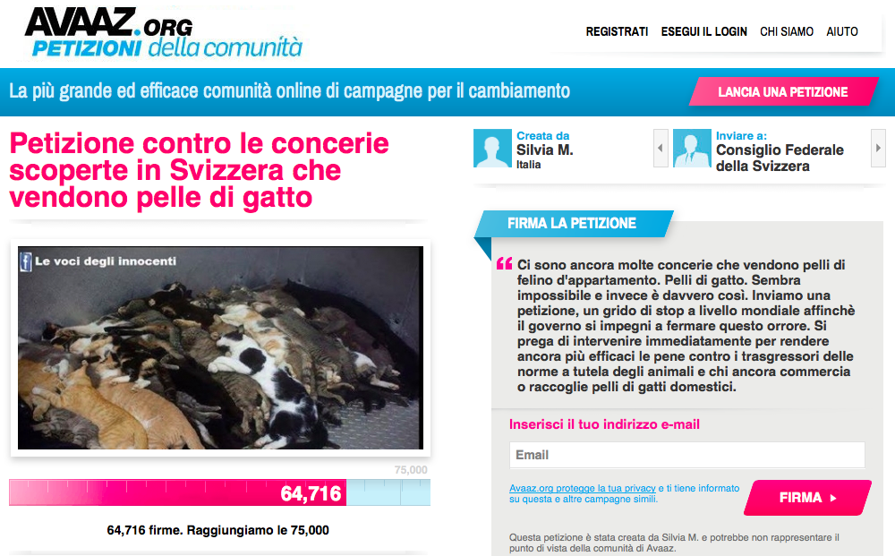 C'è un appello, su Avaaz.org, “contro le concerie scoperte in Svizzera che vendono pelli di gatto” e vuole essere “un grido di stop a livello mondiale affinchè il governo si impegni a fermare questo orrore. Si prega di intervenire immediatamente per rendere ancora più efficaci le pene contro i trasgressori delle norme a tutela degli animali e chi ancora commercia o raccoglie pelli di gatti domestici”.