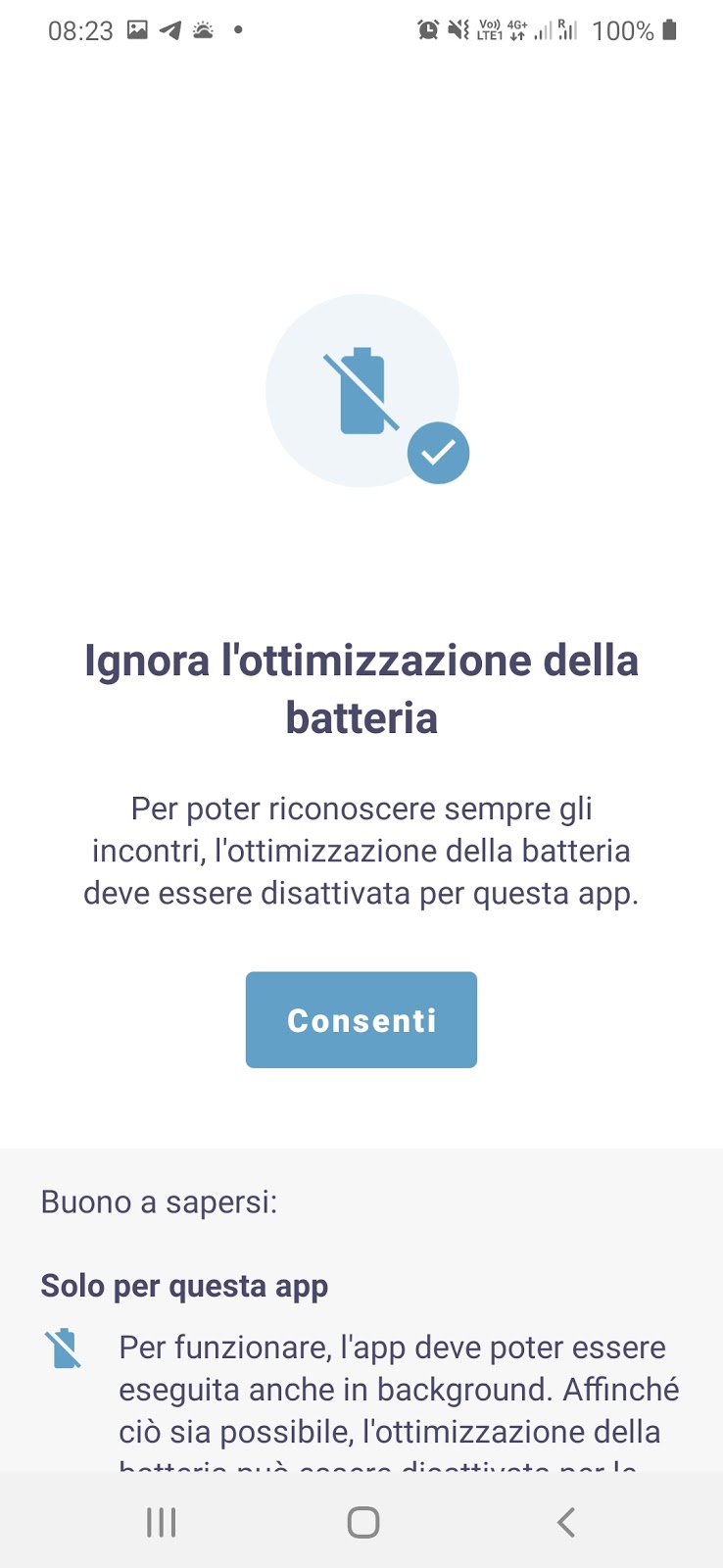 Poi viene chiesto di ignorare l’ottimizzazione della batteria in modo da consentire all’app di essere sempre attiva, anche quando è in background. Questo fa aumentare il consumo della batteria “soltanto leggermente”.