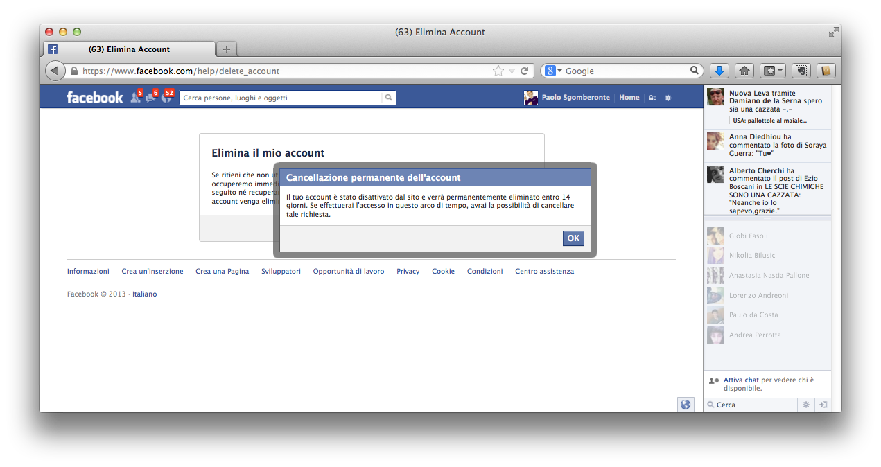 Ne ho abbastanza di perdere tempo a dis-iscrivermi a gruppi Facebook ai quali sono stato iscritto senza che me ne venisse chiesto il permesso; a ricevere e cancellare notifiche irrilevanti, nonostante un eroico sforzo di selezione degli amici; a respingere o selezionare richieste di amicizia di perfetti sconosciuti; a essere taggato nelle foto in cui non ci sono perché così chi mi ha taggato attira la mia attenzione sulla sua conversazione; a ricevere messaggi di chi mi scrive via Facebook invece di mandarmi più semplicemente e privatamente una mail. E comunque non ho tempo di perdermi in mille rivoli di conversazione; niente di personale, per carità, ma semplicemente ho poco tempo e devo scegliere con attenzione come spenderlo. Per cui oggi chiudo il mio account pubblico (Paolo Sgomberonte); manterrò quelli segreti che uso per i test.
