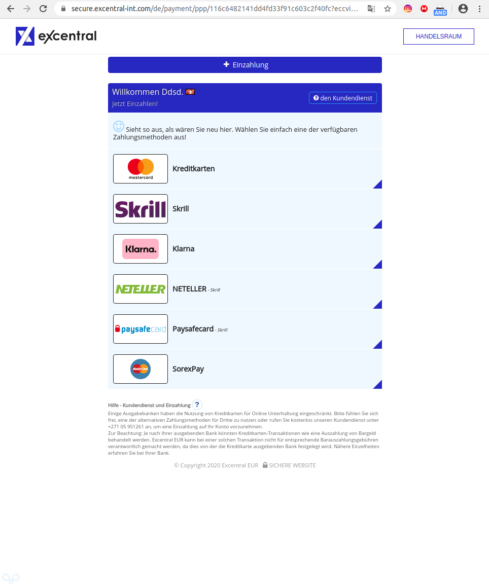 Zur Beachtung: Je nach Ihrer Bank könnte diese Transaktion als Bargeldauszahlung behandelt werden. Excentral EUR übernimmt keine Verantwortung für etwaige Bargeldauszahlungsgebühren in Zusammenhang mit dieser Transaktion. Die Transaktion wird auf Ihrer Kreditkartenabrechnung erscheinen als Excentral, falls auf Ihrer Transaktionsbestätigung nicht etwas anderes angegeben ist.